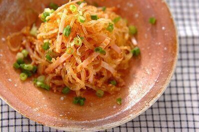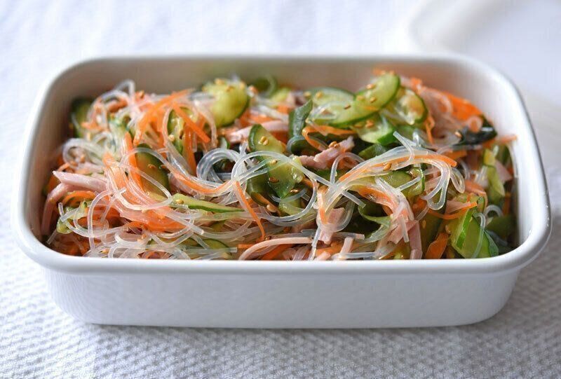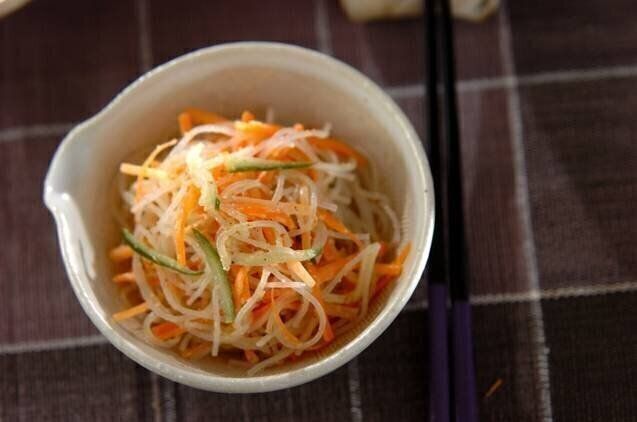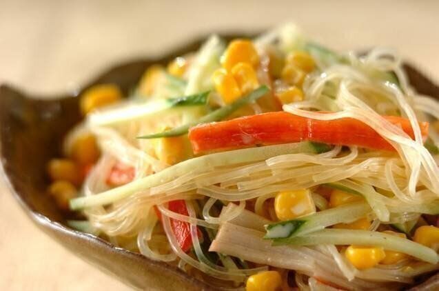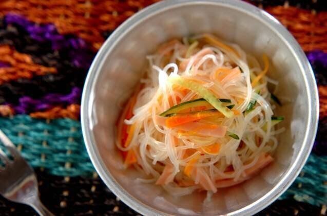 春雨のレシピの王道といえば春雨サラダ。あっさりしているので、どんなおかずとも相性バッチリ。野菜もたくさん入れれば栄養満点です。