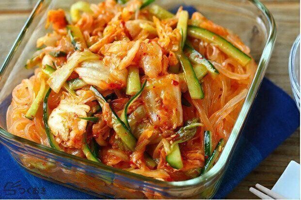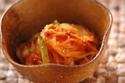 キムチの入ったピリッと辛いサラダです。キムチの汁を使って味つけするのがポイント。副菜にもお酒のお供にもぴったりです。