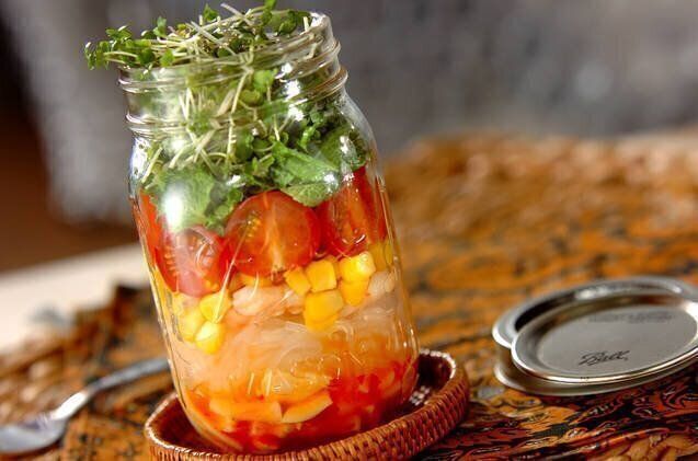 ノンオイルでつくれるエビと春雨のエスニックジャーサラダです。色鮮やかで見映えがよいので、パーティーや集まりの場への一品料理としてもおすすめ。いろいろな食材の食感を楽しめるのもうれしいポイント。