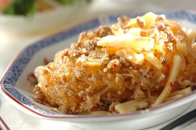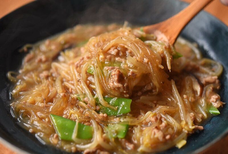 具材を炒め煮にすることで、春雨が旨味をたっぷりと吸ってモチモチ食感に。タケノコやシイタケ、ツナが入っているので旨みたっぷりです。
