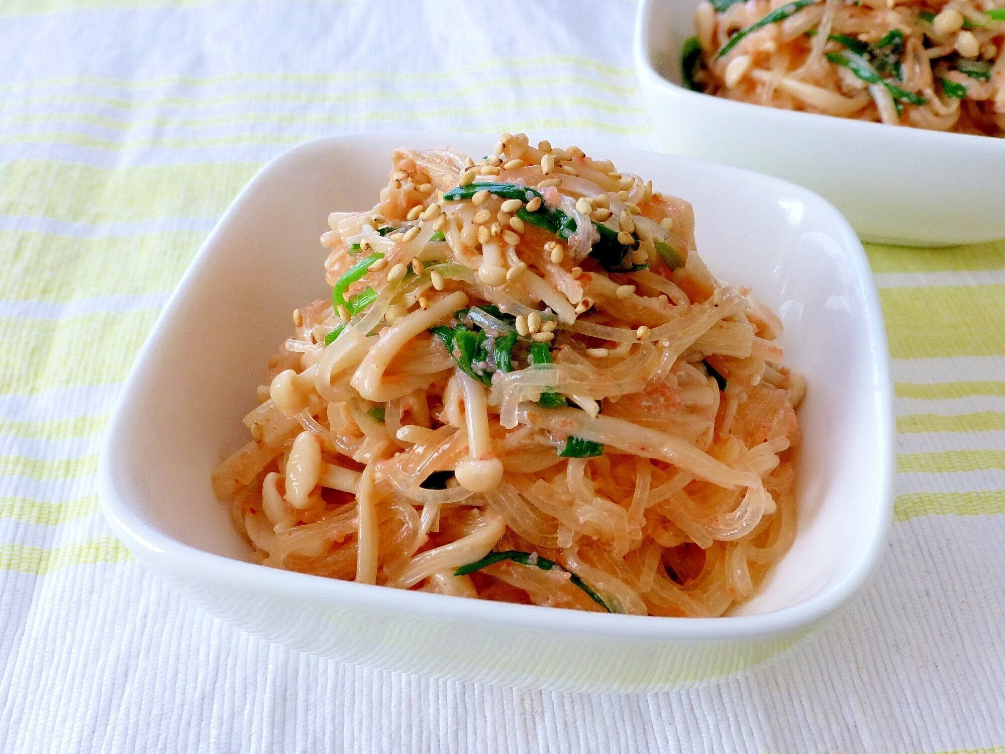 えのきと辛子明太子をマヨネーズで和えた、春雨レシピです。つくるときは、春雨の水気をしっかり切ることがポイント。いつもの春雨レシピに飽きたとき、おすすめの一品です。