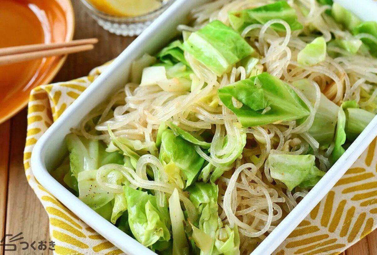 春雨×キャベツでボリュームたっぷりな塩チャプチェ!お子さまOKなメインのおかずレシピです。にんじんの千切りは、スライサーなどをつかって時短するのもおすすめ。肉と野菜が一緒に食べられるのもうれしいポイントです。