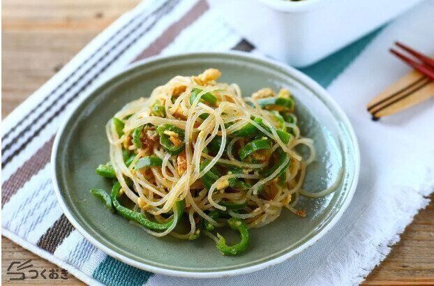 ひき肉ピーマン春雨の中華炒めは、オイスターソースのうま味が春雨にからんでパクパク食べられる一品です。ひき肉とピーマンも入ってボリューム満点!時間が経っても、温め直せばもちもち食感を楽しめます。
