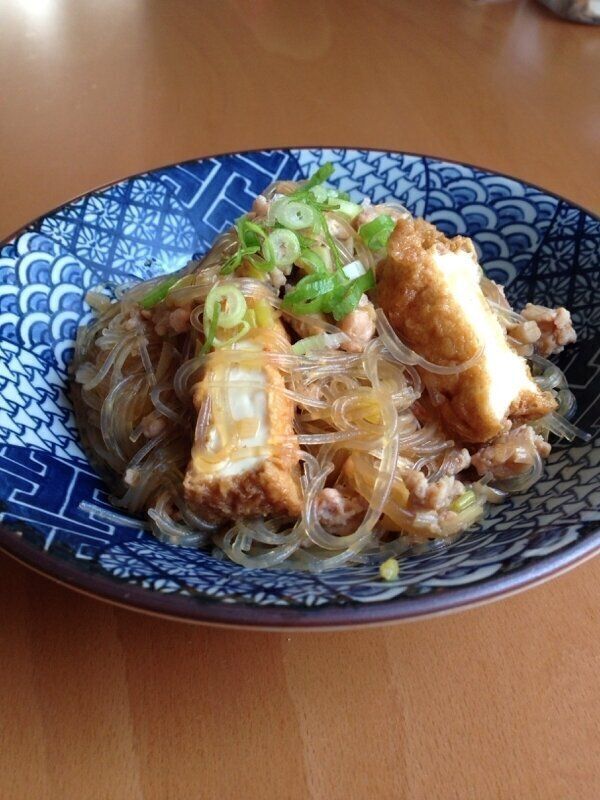 厚揚げでボリュームがアップした春雨のピリ辛煮レシピ。具材をいためて煮込むだけ、調理時間は約10分とすぐにできあがります。ピリ辛な味なのでごはんによく合いますよ。