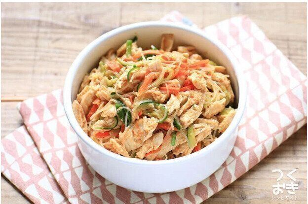 ごまみそで味つけした蒸し鶏と春雨のサラダは、高たんぱく低カロリーでダイエット中や食生活に気を遣っている人も安心して食べられる一品です。春雨をゆでるときに牛乳をプラスすることで、春雨同士がくっつきにくくなるそうなので、覚えておくと便利ですね。