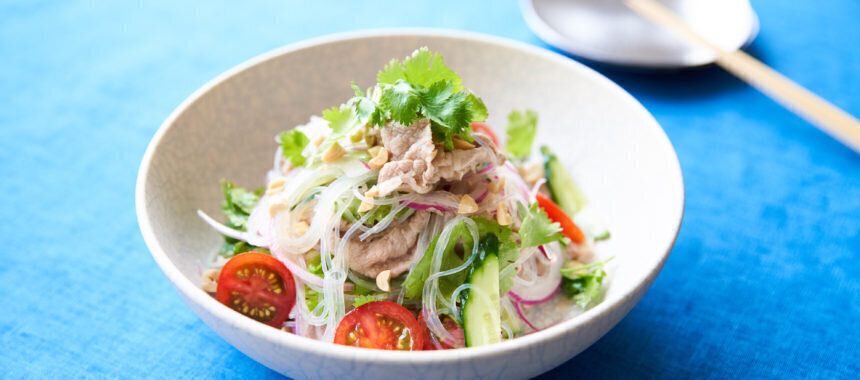 きゅうりやトマト、紫玉ねぎなど彩り豊かな野菜をたっぷり使った、タイ風の豚しゃぶ春雨サラダレシピ。豚肉と春雨は先に味をつけ、食べる直前に野菜を加えるとシャキシャキ感が残りますよ。
