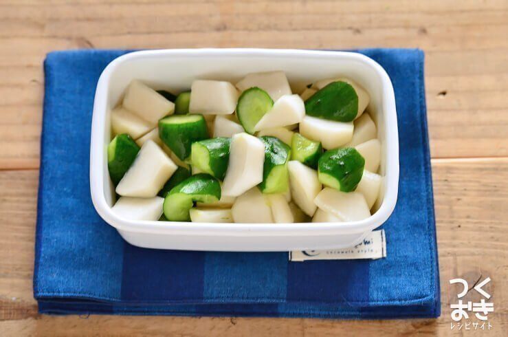 切って漬けるだけの簡単レシピ、かぶときゅうりの塩漬けです。彩りがよく、ほどよい味加減の浅漬けは箸休めやお弁当のおかずにもぴったり。ひと晩以上漬けると、よりおいしく食べられますよ。