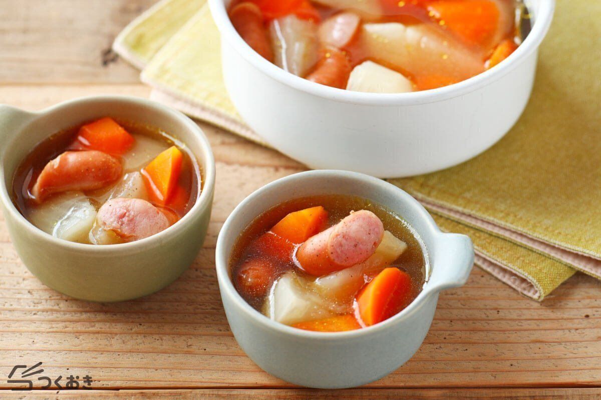 かぶ・ソーセージ・にんじんなど、具だくさんなコンソメスープのレシピ。ほっこりとしたかぶと熱々なスープで、体の芯から温まりそうですね。仕上げに粉チーズや唐辛子パウダーをかけても◎。