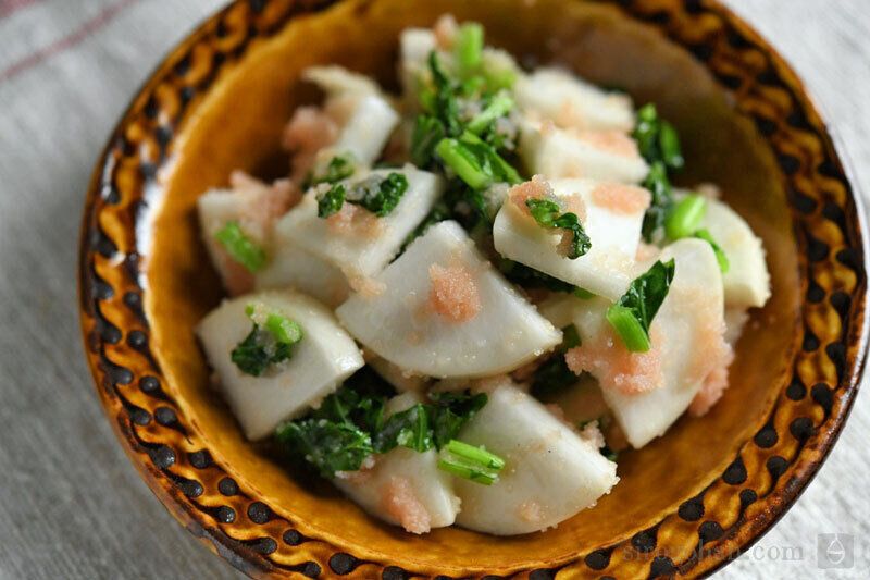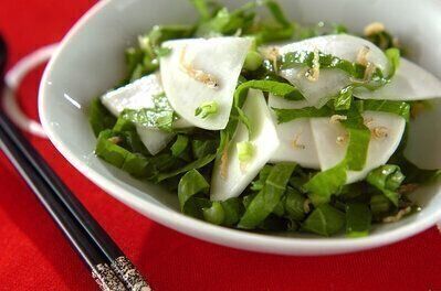 かぶは皮を剥かずにそのまま使うのがポイント。あっさりしたかぶにカリカリにあげたおじゃこの香ばしさがマッチして絶品です。