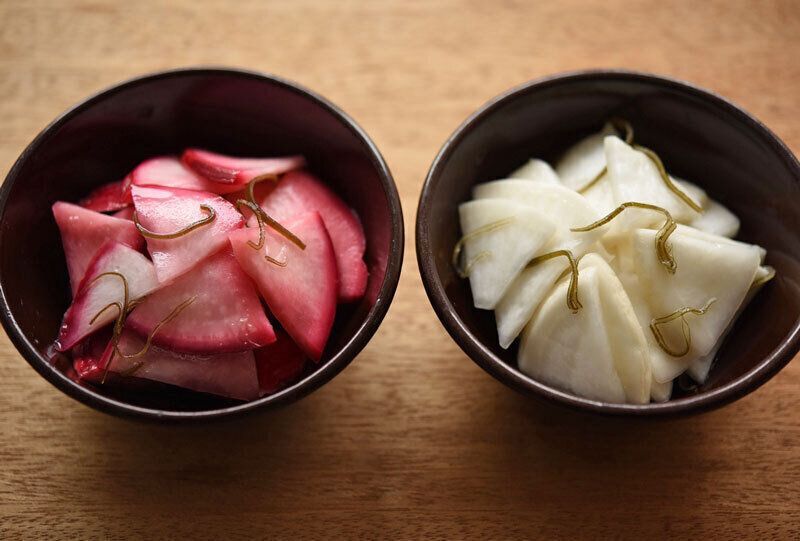 赤かぶと玉かぶを使った、定番の漬物レシピ。赤かぶは皮ごと漬けることで、鮮やかな赤色のグラデーションに仕上がります。7~10日程度日持ちするので、常備菜にも最適です。