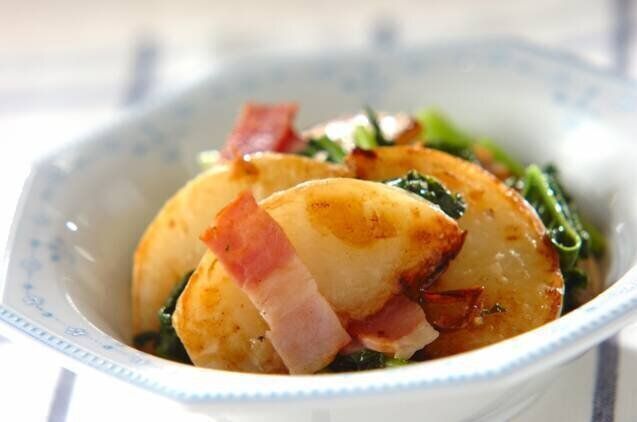 シンプルな味つけで、素材の味わいを感じられそうな、カブとベーコンのバターソテー。約10分で完成するので、手軽に作れる副菜やおつまみにも。かぶの葉も加えて彩り豊かに仕上げます。