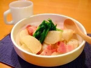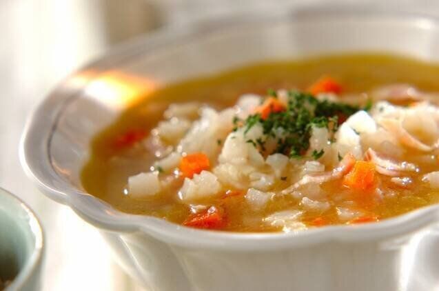 ベーコン、玉ねぎ、かぶなど、具だくさんのスープのレシピです。シンプルな味つけでやさしい味わいに。ほっこり温まりたい時、野菜をたっぷり食べたい時にもよさそうです。