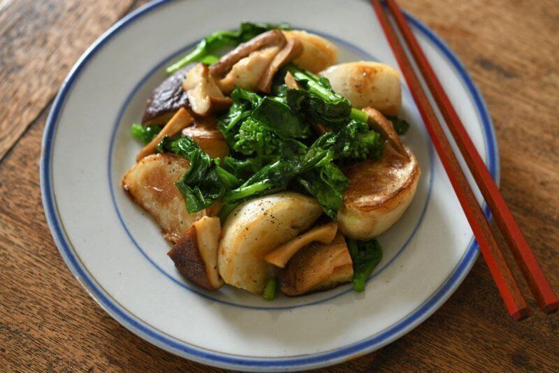 「かぶと菜の花の炒め物」はオリーブオイルを使ってじっくりとかぶとしいたけを炒めるレシピ。じっくり炒めたあとに調味料で味を調えて完成です。オリーブオイルの風味でよりおいしくカブを食べることができますよ。