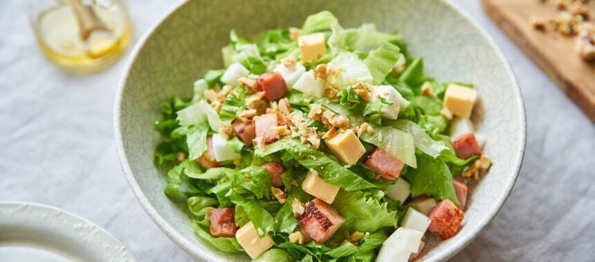 グリーンサラダをベースとしていますが、かぶのほかにもベーコンやチーズをトッピングするので、食べ応え抜群のサラダです。手作りドレッシングがおいしさを引き立てるポイント。