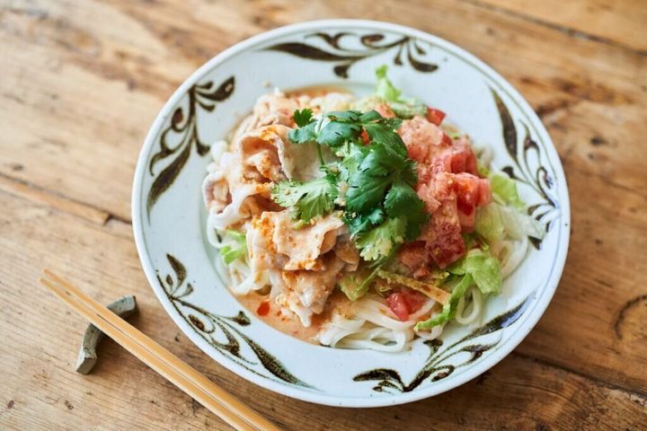 エスニックな味わいを楽しめる、麵料理のレシピ。目玉焼きや香菜も添えて彩り豊かにいただきます。うどんの代わりに、そばでもおいしくつくれるとのこと!麵を変えてアレンジを楽しむのもよいですね。