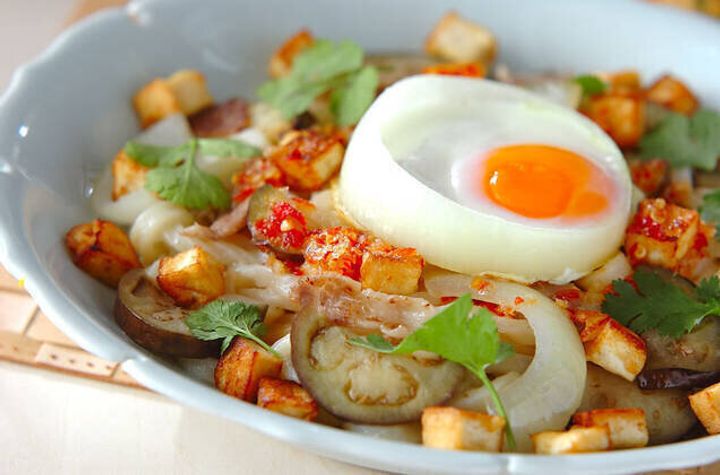 豆板醤の辛みが効いた肉味噌あんがよく合う、冷やしうどんのレシピです。なすは素揚げすることで、色が鮮やかになりトロッとした食感に!なすには体を冷やす作用があるため、夏におすすめの一品です。