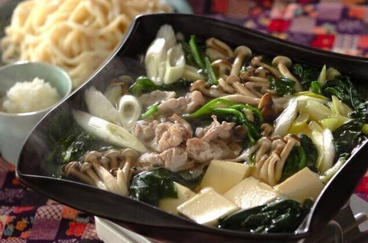 さっぱり食べたい時にぴったりの、豚とホウレン草の塩鍋。野菜もうどんもお肉も、バランスよく味わえそうです。大根おろしや七味唐辛子など、お好みの薬味と一緒に!