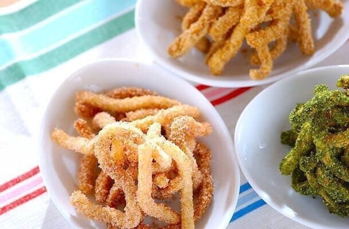 一口サイズにカットしたうどんを揚げて、スナック菓子風に仕上げた一品。カリカリの食感と、きな粉や抹茶の甘じょっぱい味つけが後ひくおいしさです。好みで七味唐辛子などを加えて、お酒のおつまみにするのもおすすめです。