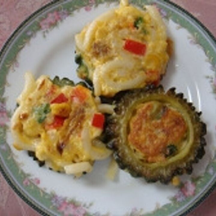 ゴーヤを器にした、変わりうどん焼きのレシピです。うどんと材料を混ぜ合わせて詰め、焼くだけで簡単につくれます。彩りがよくパクッと食べやすいので、おやつやおつまみにもぴったり。