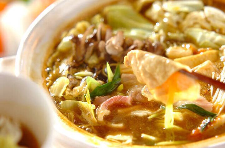 和な味つけでほっと癒されそうな、カレーポーク鍋のレシピです。「だし溶きカレー片栗」のとろみで、お肉や野菜、うどんもパクパク食べやすそう。その日の気分で、しめメニューをアレンジするのもよいですね!