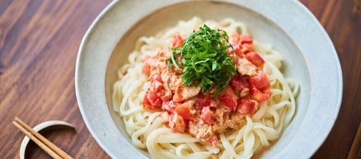 さっぱりと食べることができ、暑くて食欲がないときにもおすすめの「冷凍トマトの冷やしうどん」。トマトは丸ごと3~4時間冷凍してすりおろすのがポイント。シャリシャリとした食感を楽しむことができますよ。