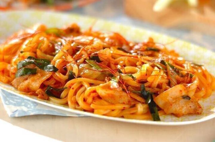 パパッとつくって食べられる、スタミナ豚キムうどんのレシピ。手作りなので、辛いものが苦手でも味の調整がしやすいのがうれしいところです。手早くエネルギーをチャージしたいときにぴったりのメニューですよ。