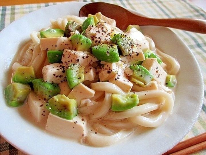 アボカドと豆腐の濃厚なソースが絡む、クリーミーうどんのレシピです。とろとろのソースにするために、豆腐をしっかりと水切りするのがポイント。仕上げに粗びきこしょうを振って、味を引き締めましょう。