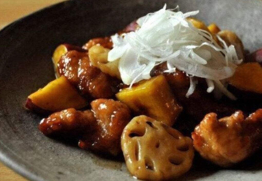 黒酢の甘酢あんが豚肉とさつまいもにしっかりとからんでおいしい酢豚は黒酢あんの甘ずっばさとお肉の旨味が絶品で食べ出したら止まらなくなる一品です。さつまいもやレンコンのほかにも好みの野菜をプラスすればこれ一品でたんぱく質も野菜もしっかりとれて食べ応えもアップします。