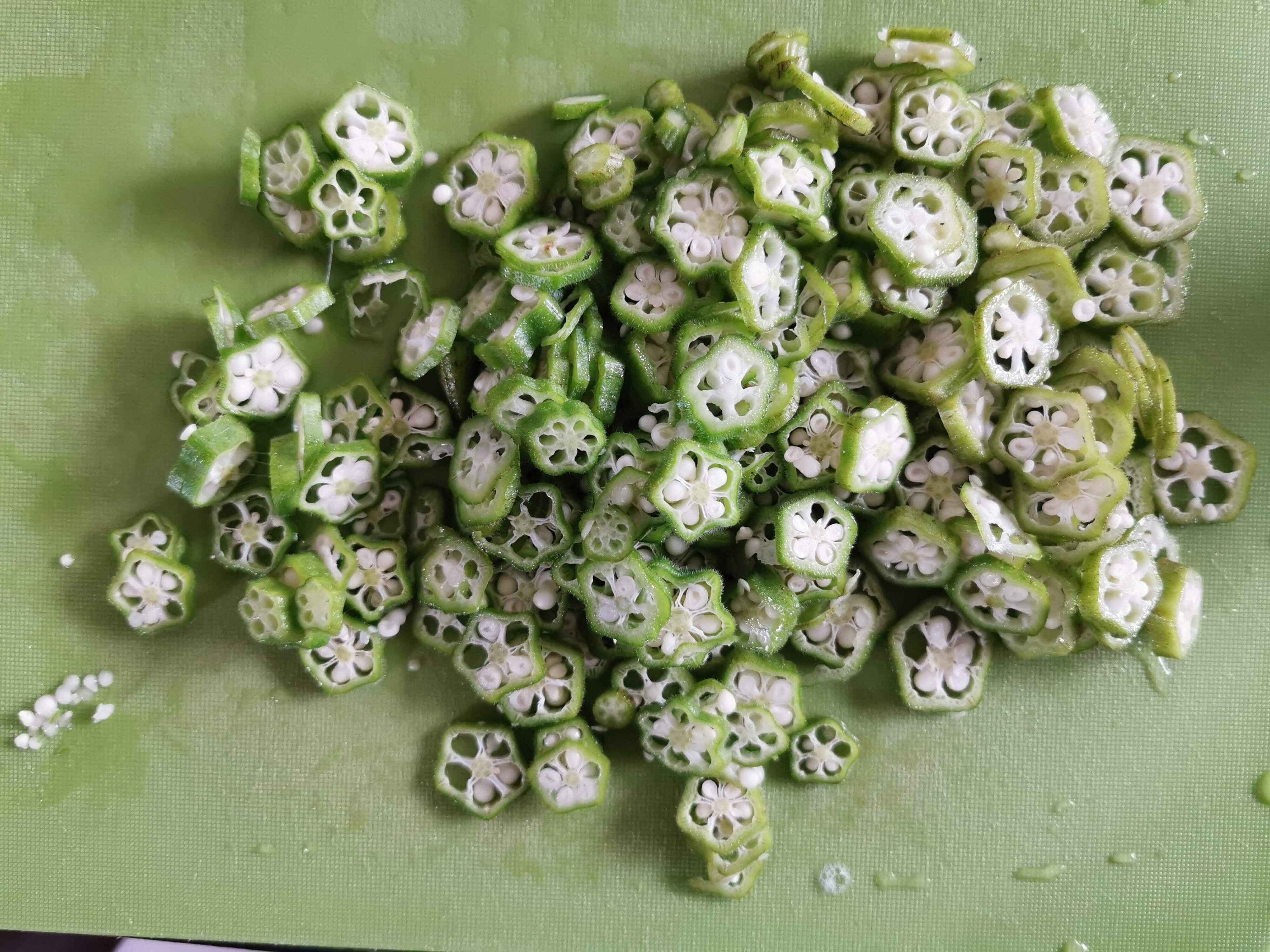 (1)オクラに塩(分量外)をまぶして板ずりしてオクラのウブ毛を取る。