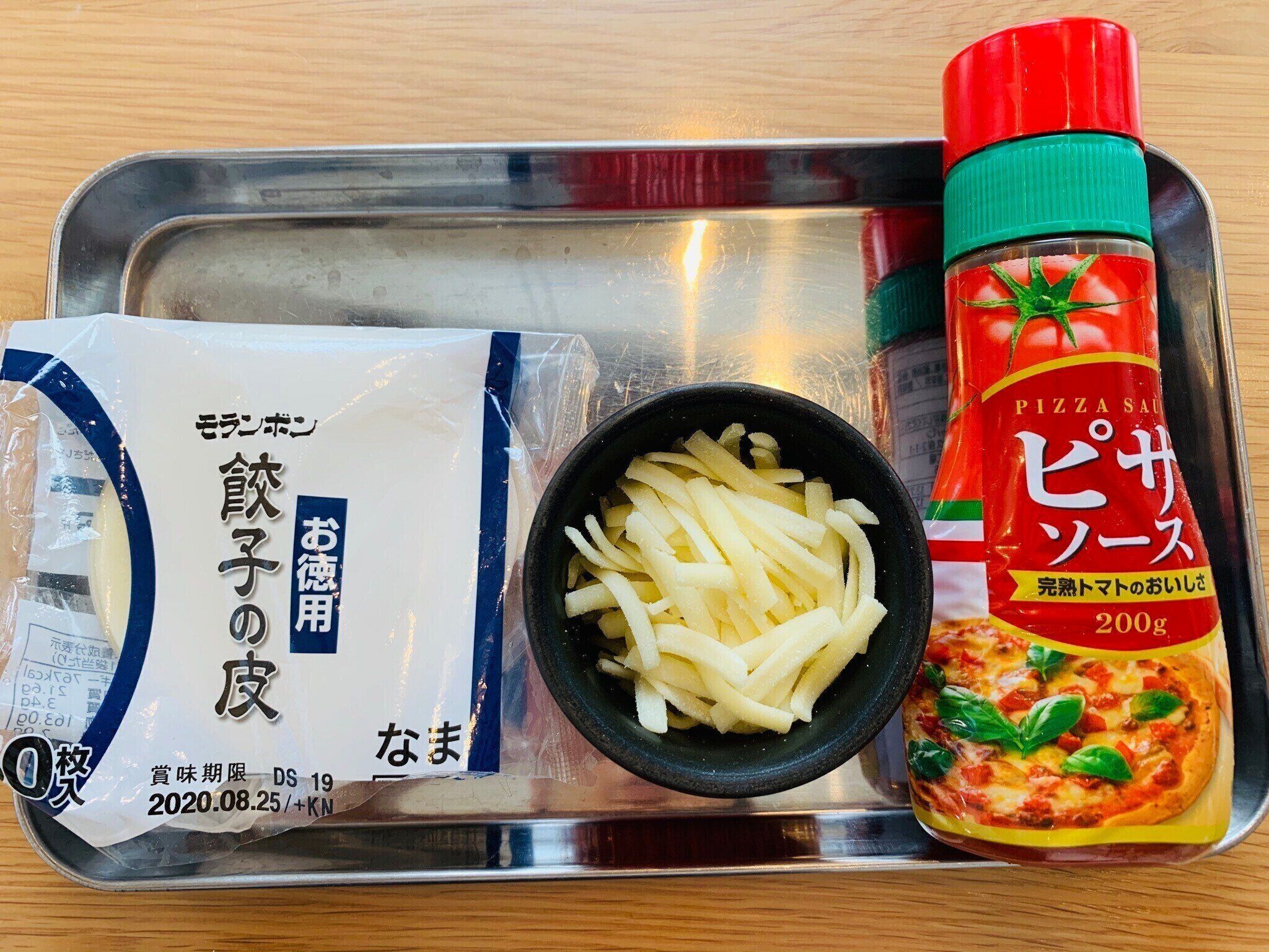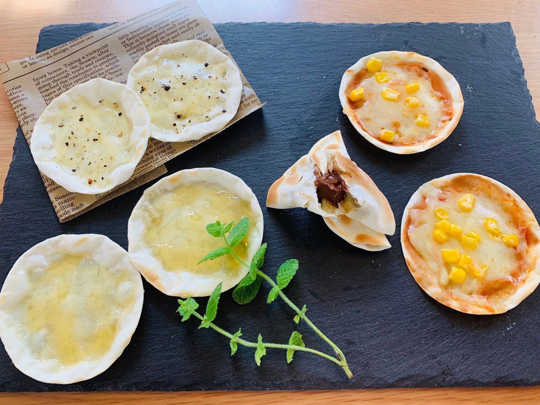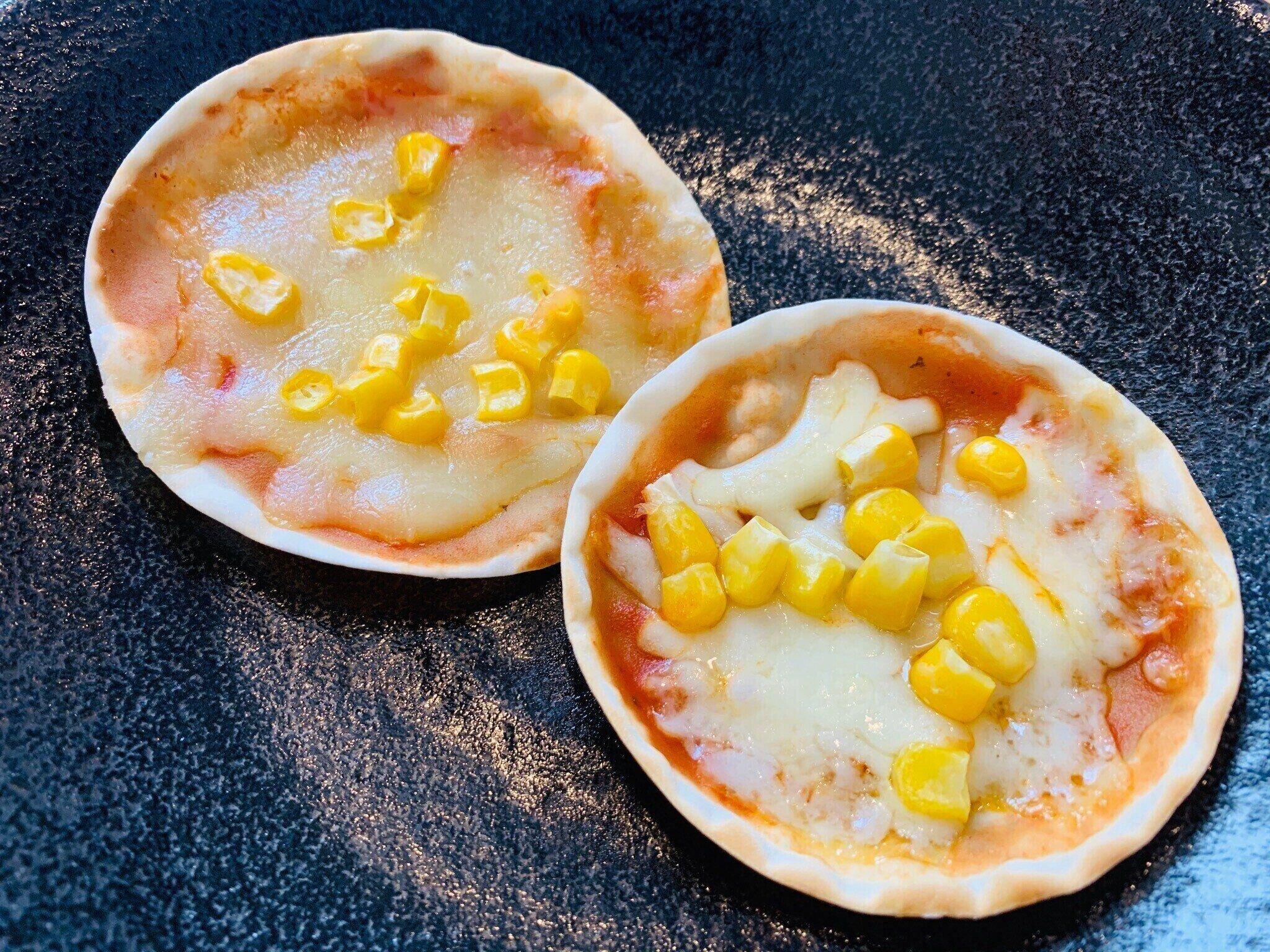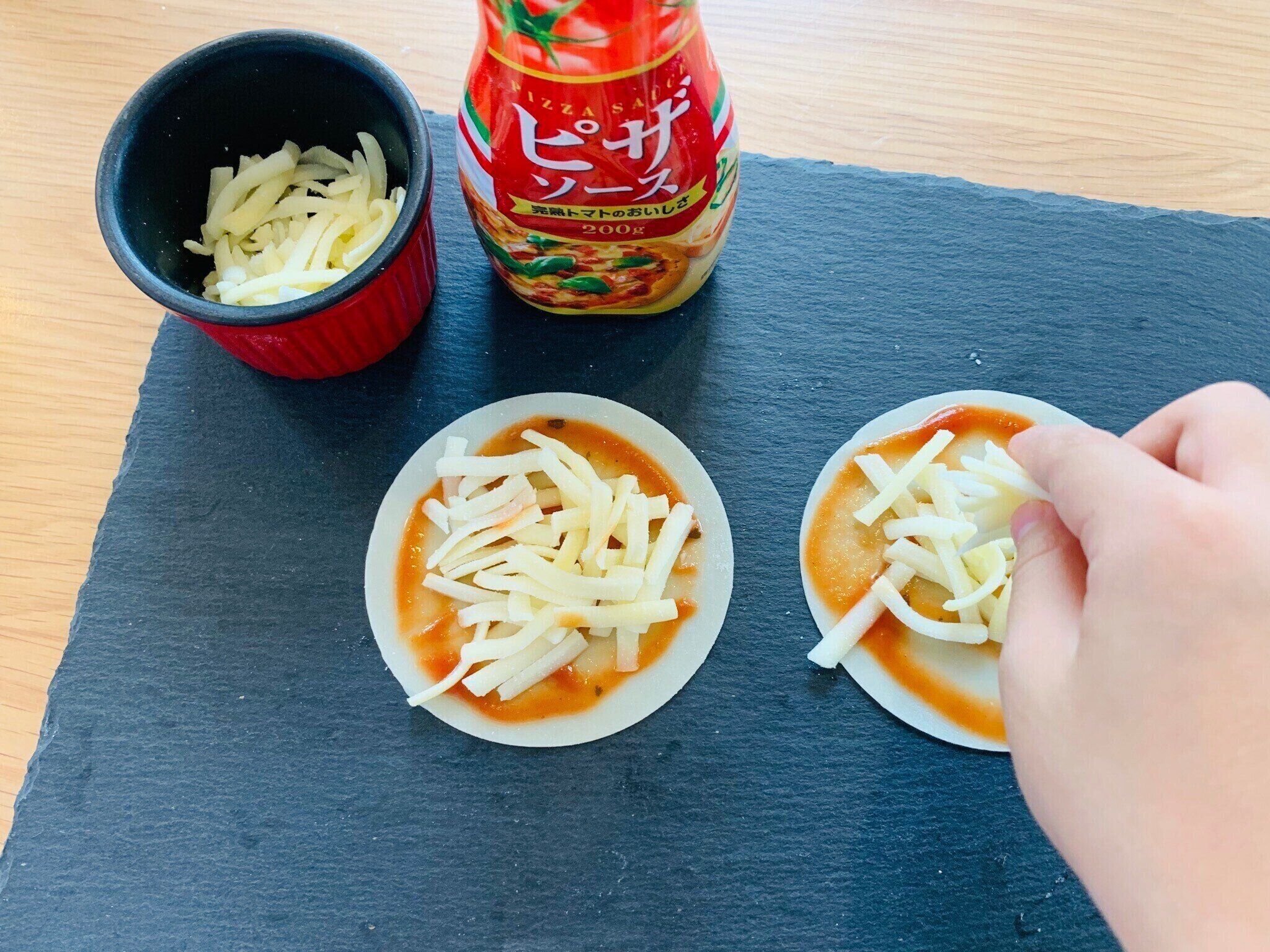 餃子の皮をピザ生地に見立てたワンハンドピザ。ピザソースにチーズや好きな具を乗せてトースターで2~3分焼いて完成です。