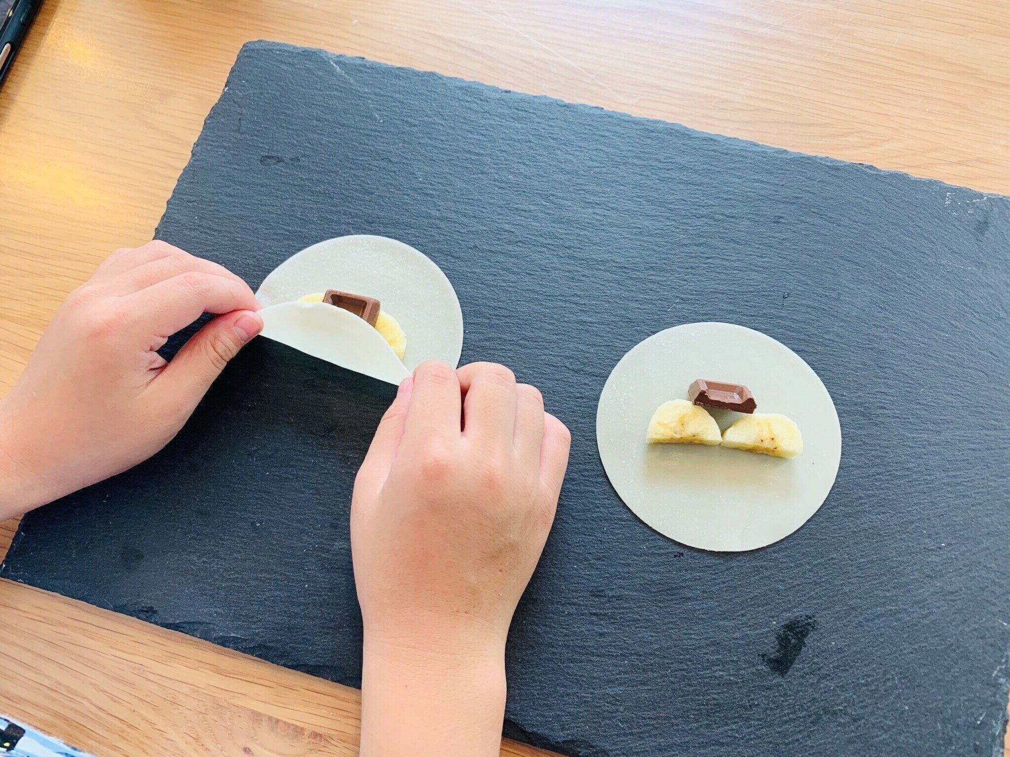餃子の皮に小さく切ったバナナと、小さく割った板チョコを置いて包みます。