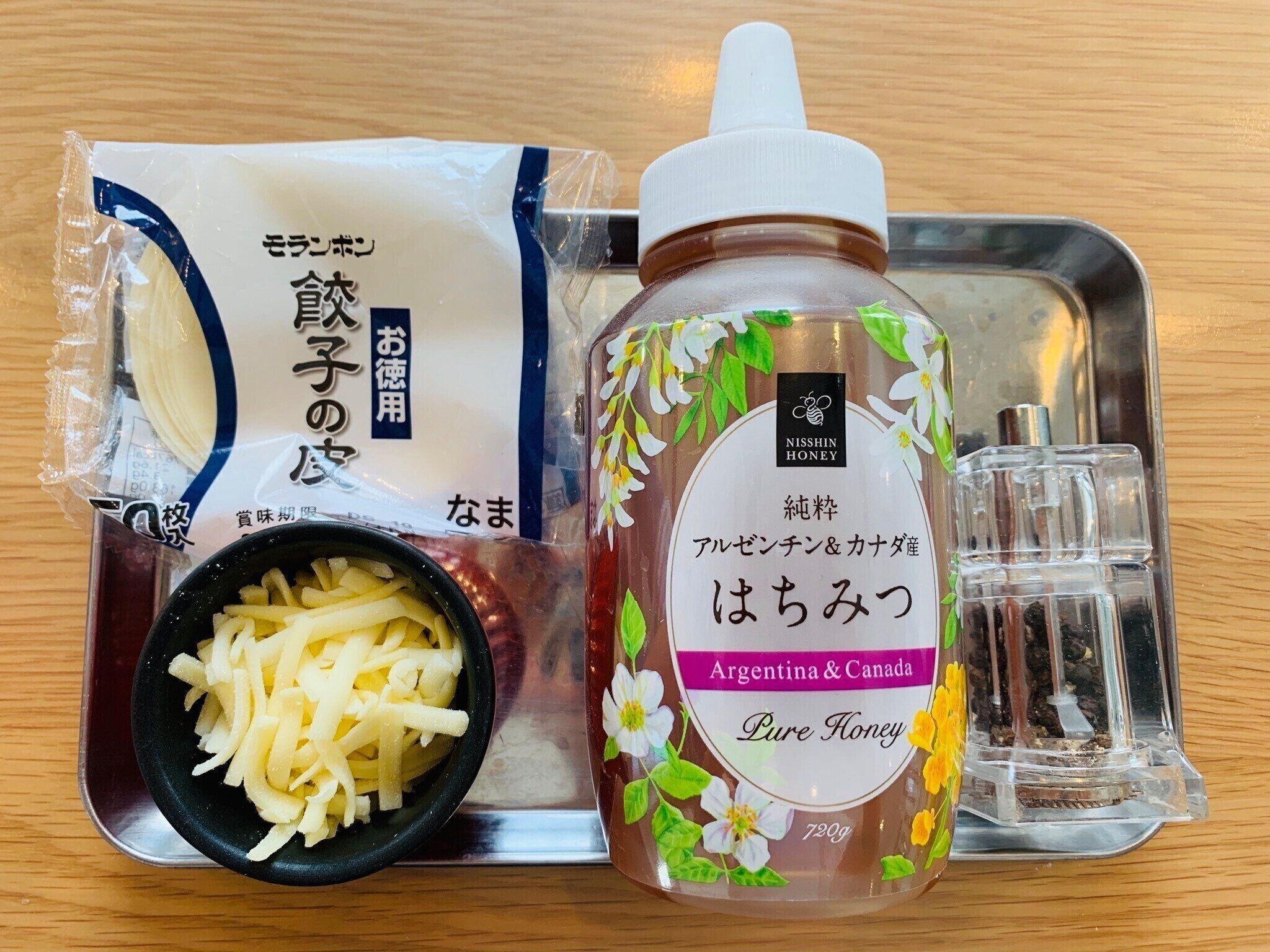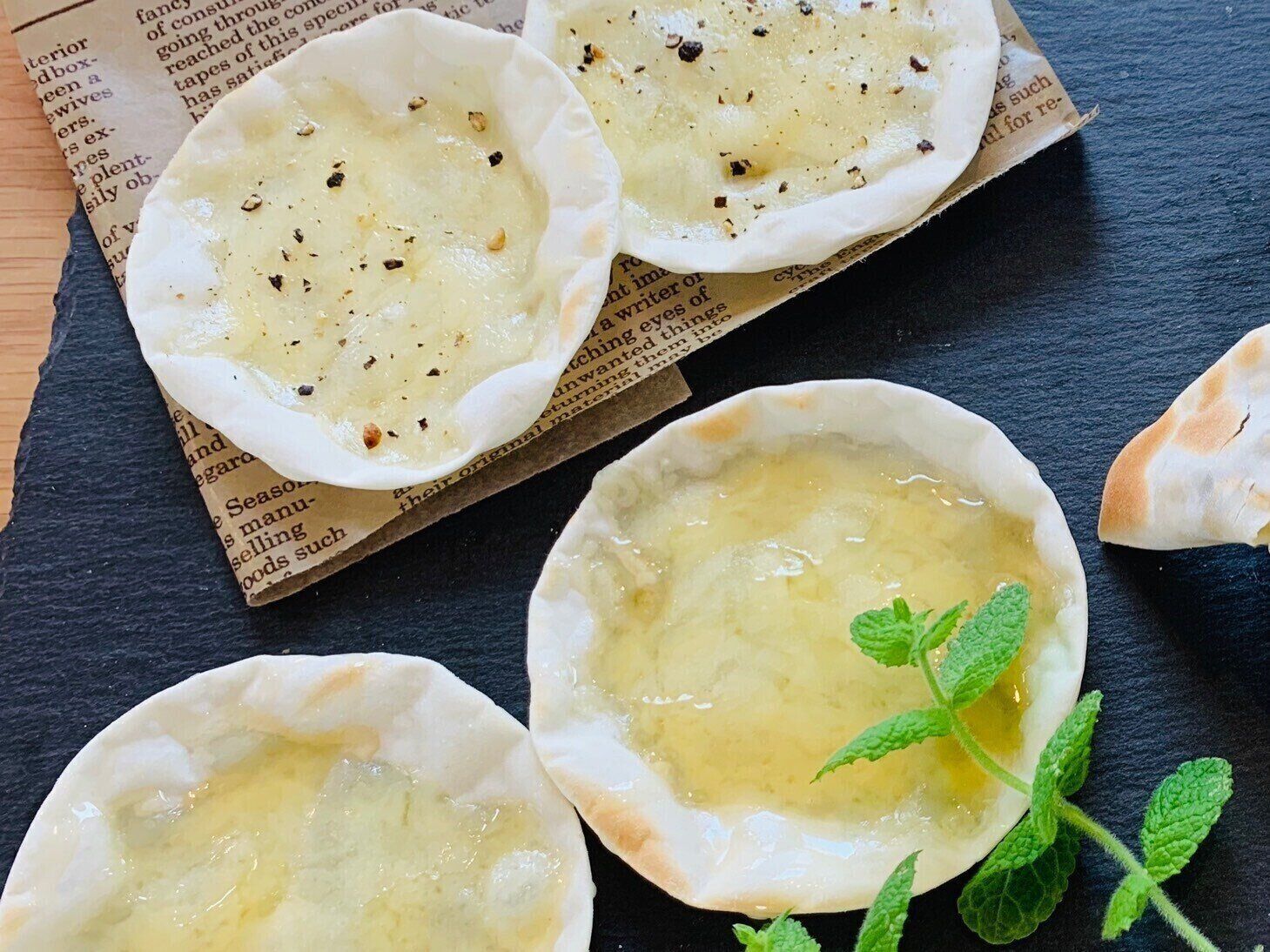 最初に餃子の皮にチーズをのせてトースターで2~3分焼きます。焼けたらお好みで、ブラックペッパーかはちみつをかけて出来上がり!ワインのおつまみにオススメです。
