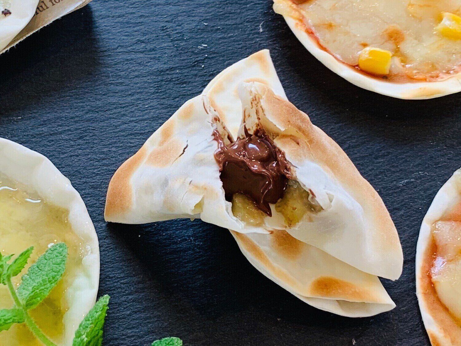 焼き立てはチョコがトロトロにとろけて特に美味しいです。チョコがとろけるので、半分に包んで焼くと子供も食べやすいおやつができます。