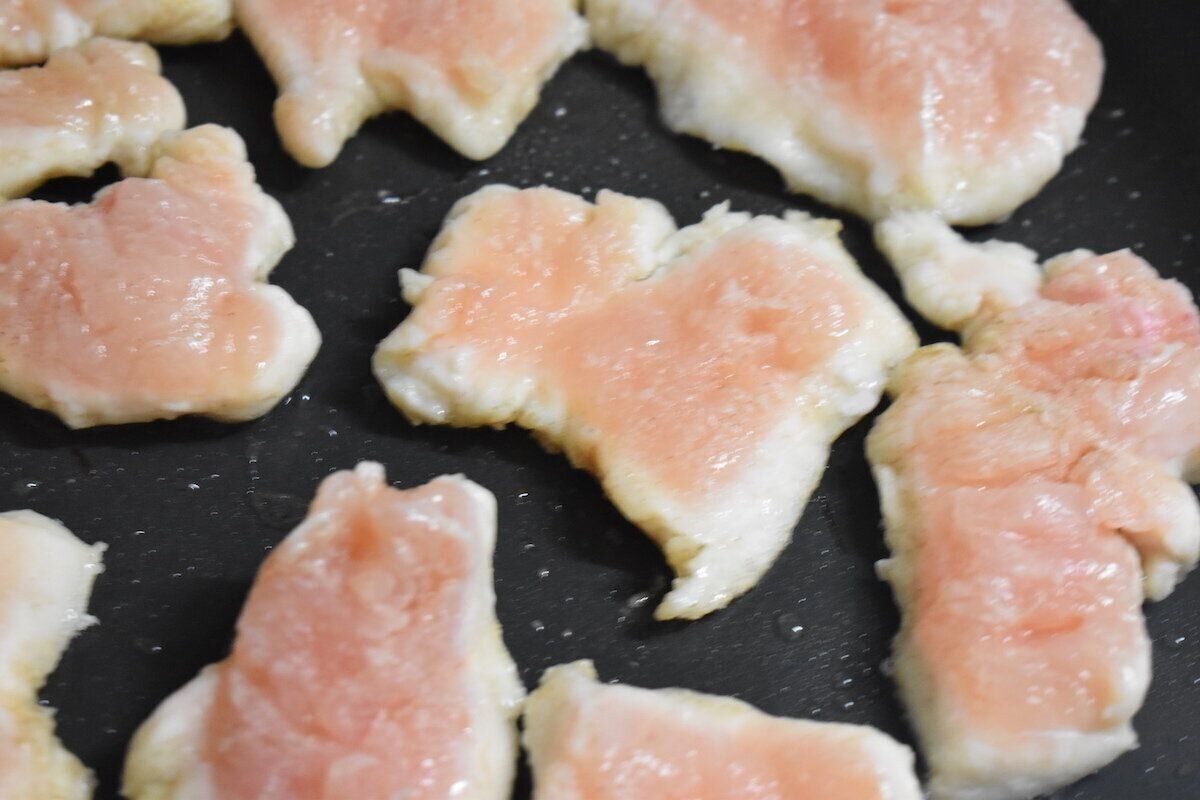 (4)フライパンにサラダ油を熱し、鶏肉を入れ、強めの中火で焼く。