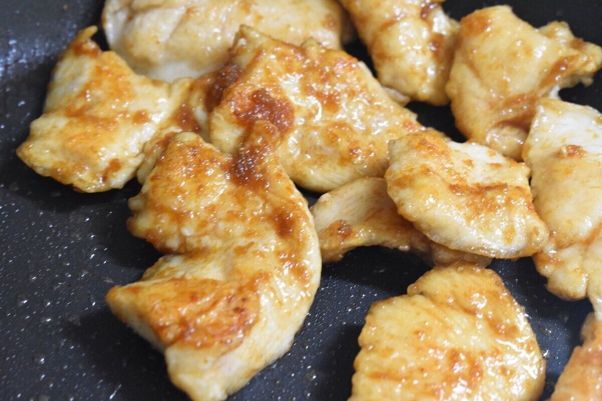 (5)両面こんがり焼けたら、あらかじめ作ったタレを入れ「強火」にしてフライパンを揺すって絡めます。全体に絡まったら火を止め完成です。