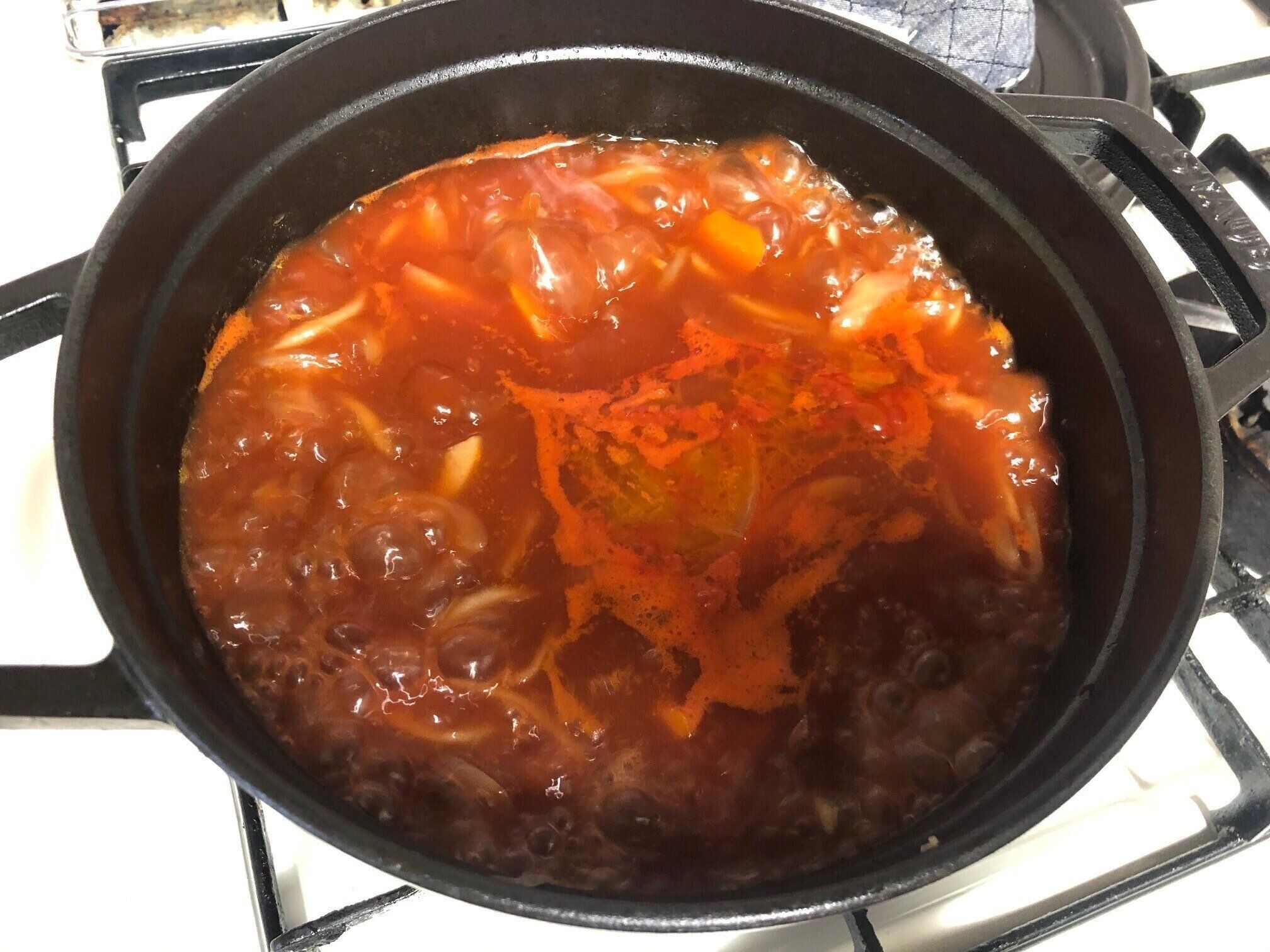 ポイント1:トマトジュースと赤ワインを入れて煮込む