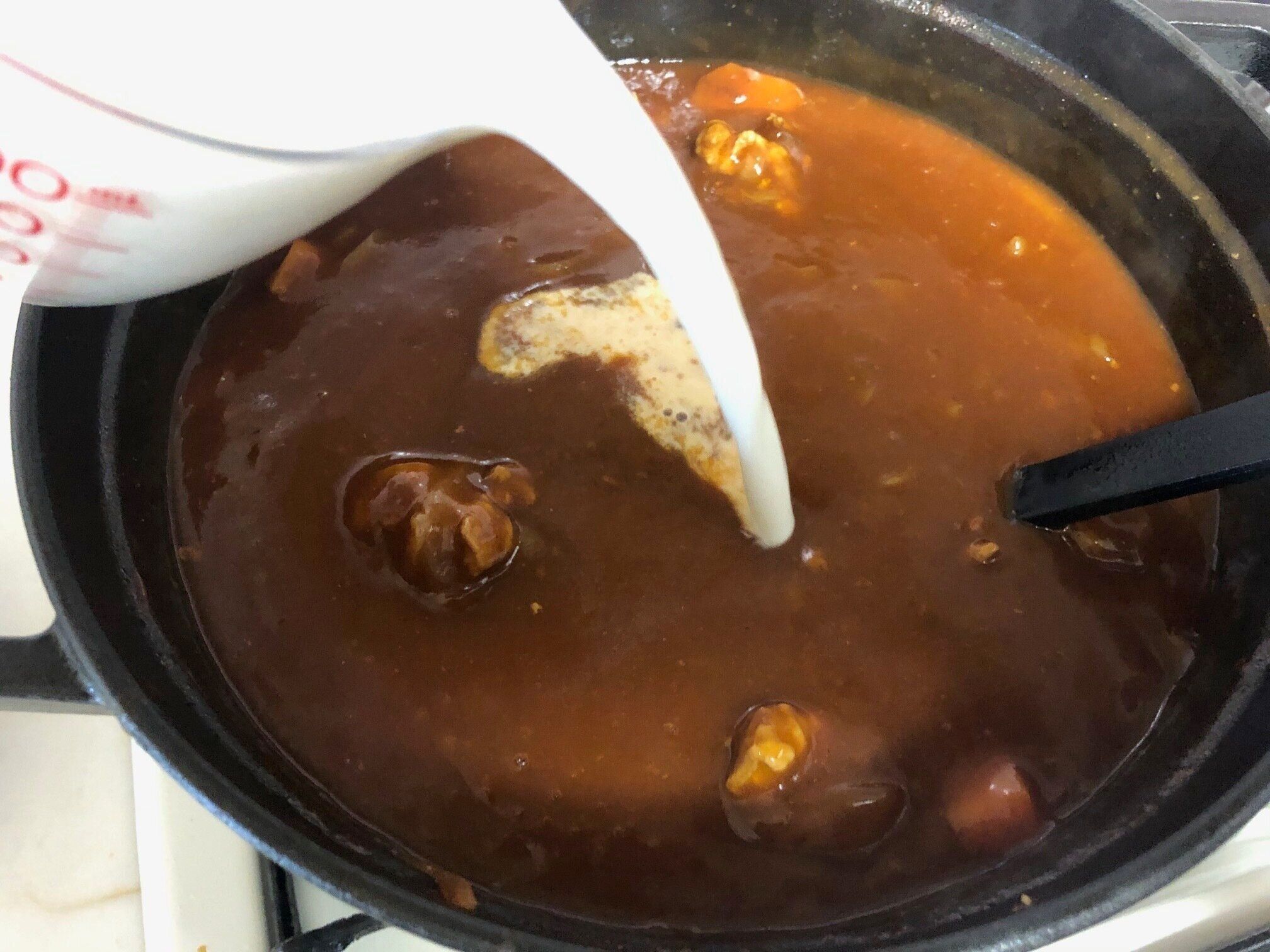 いったん火を止めルーを割り入れよく溶かします。ルーが完全に溶けたら牛乳200㏄を入れ、混ぜながら5分ほど再び煮れば完成です。