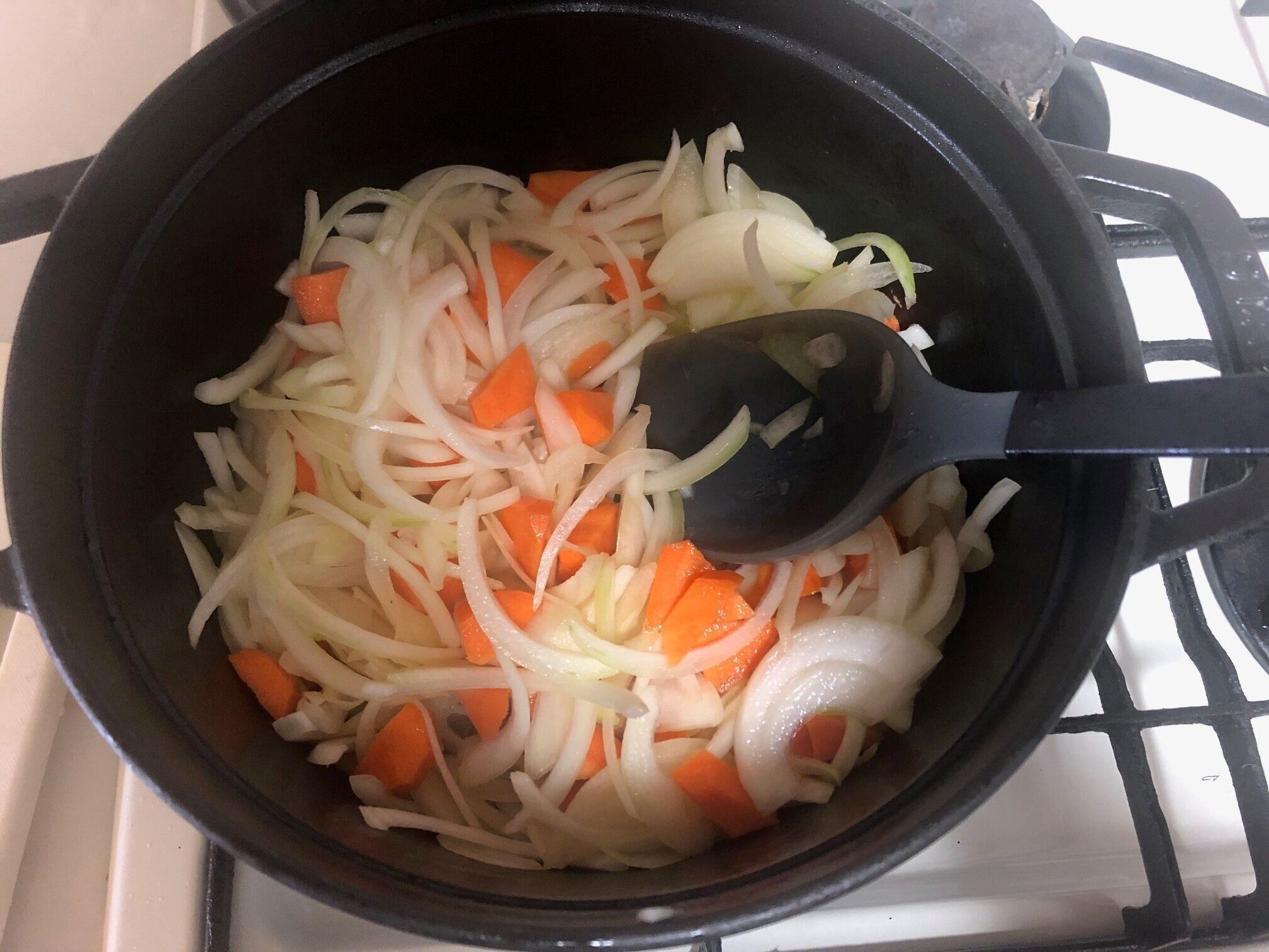 まずは鍋を中火で温め、オリーブオイルを入れ具材を5~10分程度じっくり炒めます。
