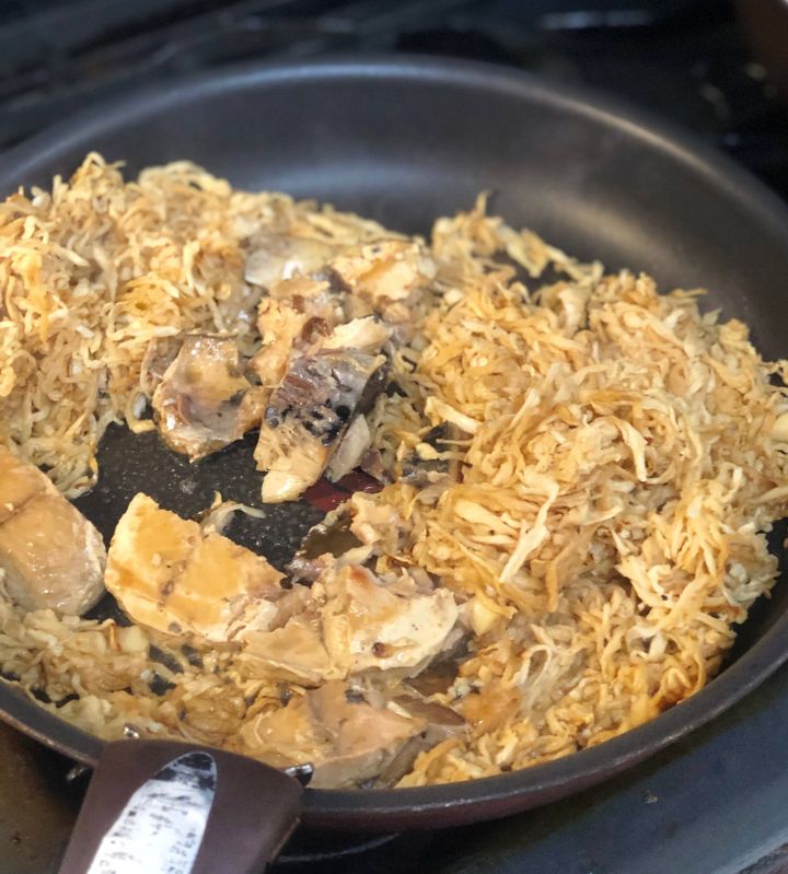 (7)切り干し大根の汁気が少ない場合は、最初に用意したお湯で溶いたコンソメスープで加減します。味が濃くなりすぎる場合は水でもOK。