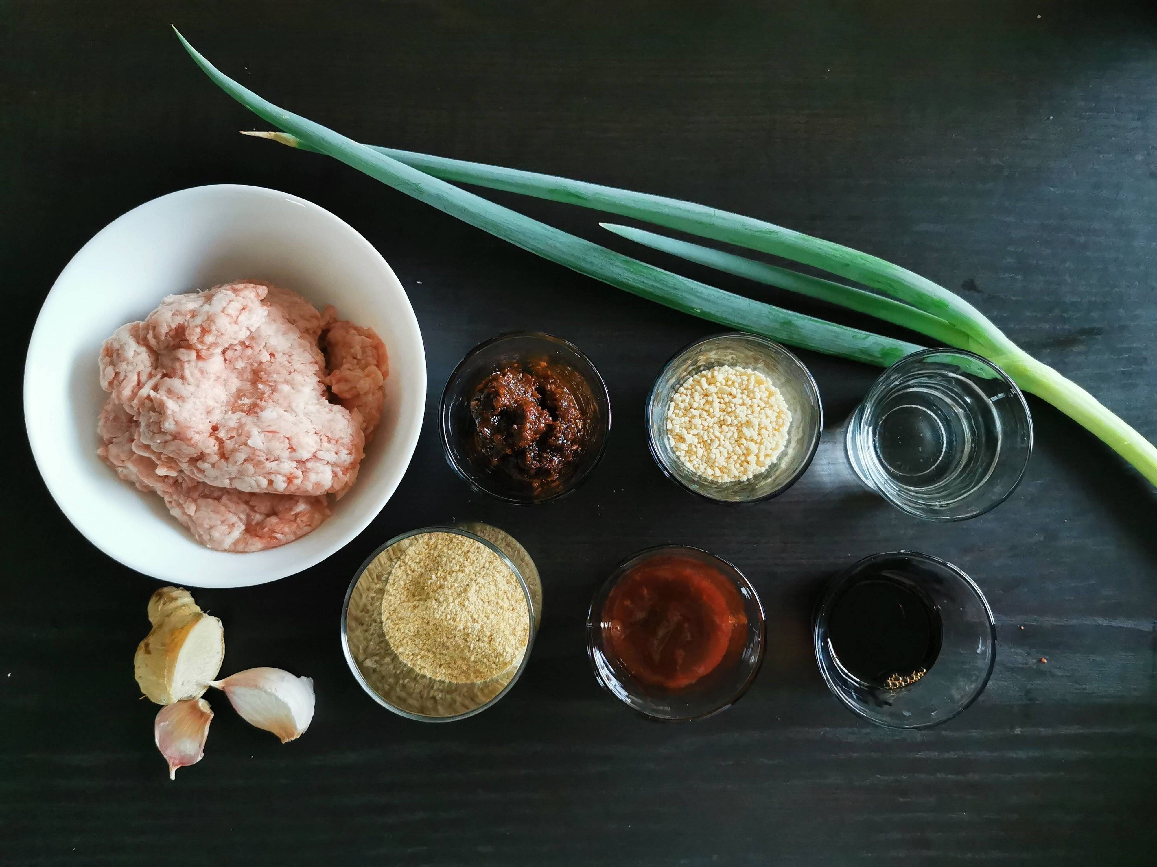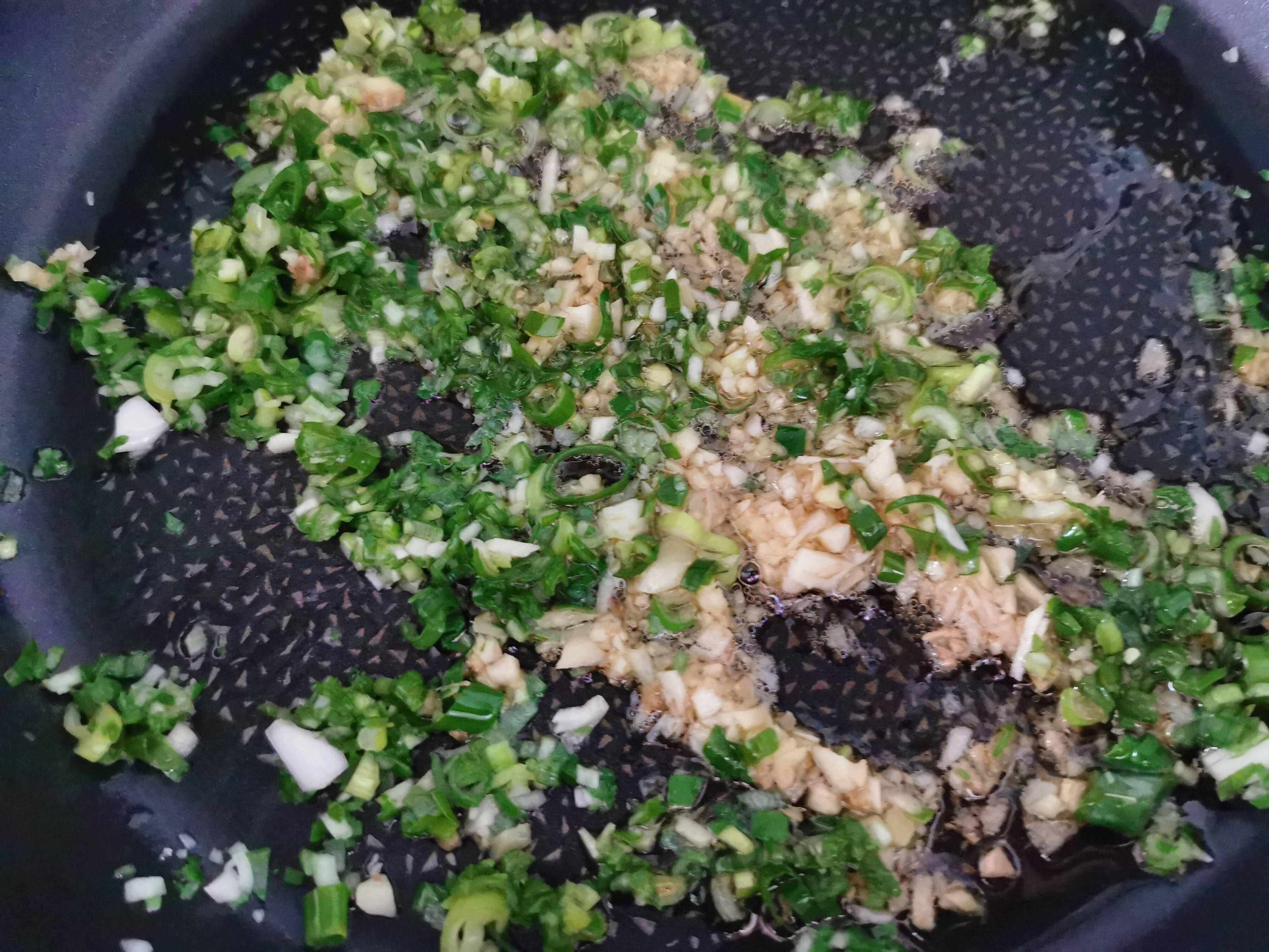 (1)ネギ、生姜、ニンニクを微塵切りにする。