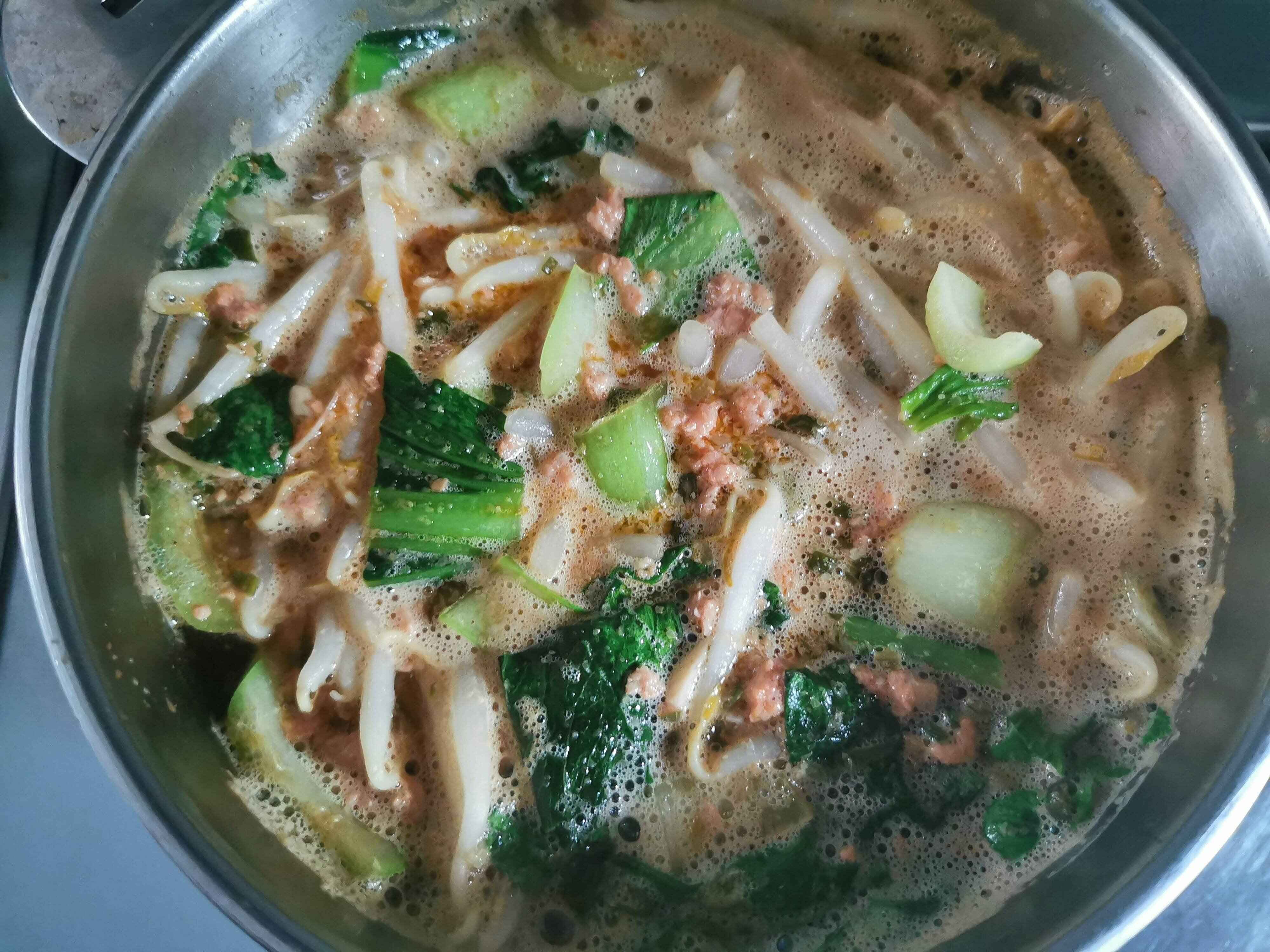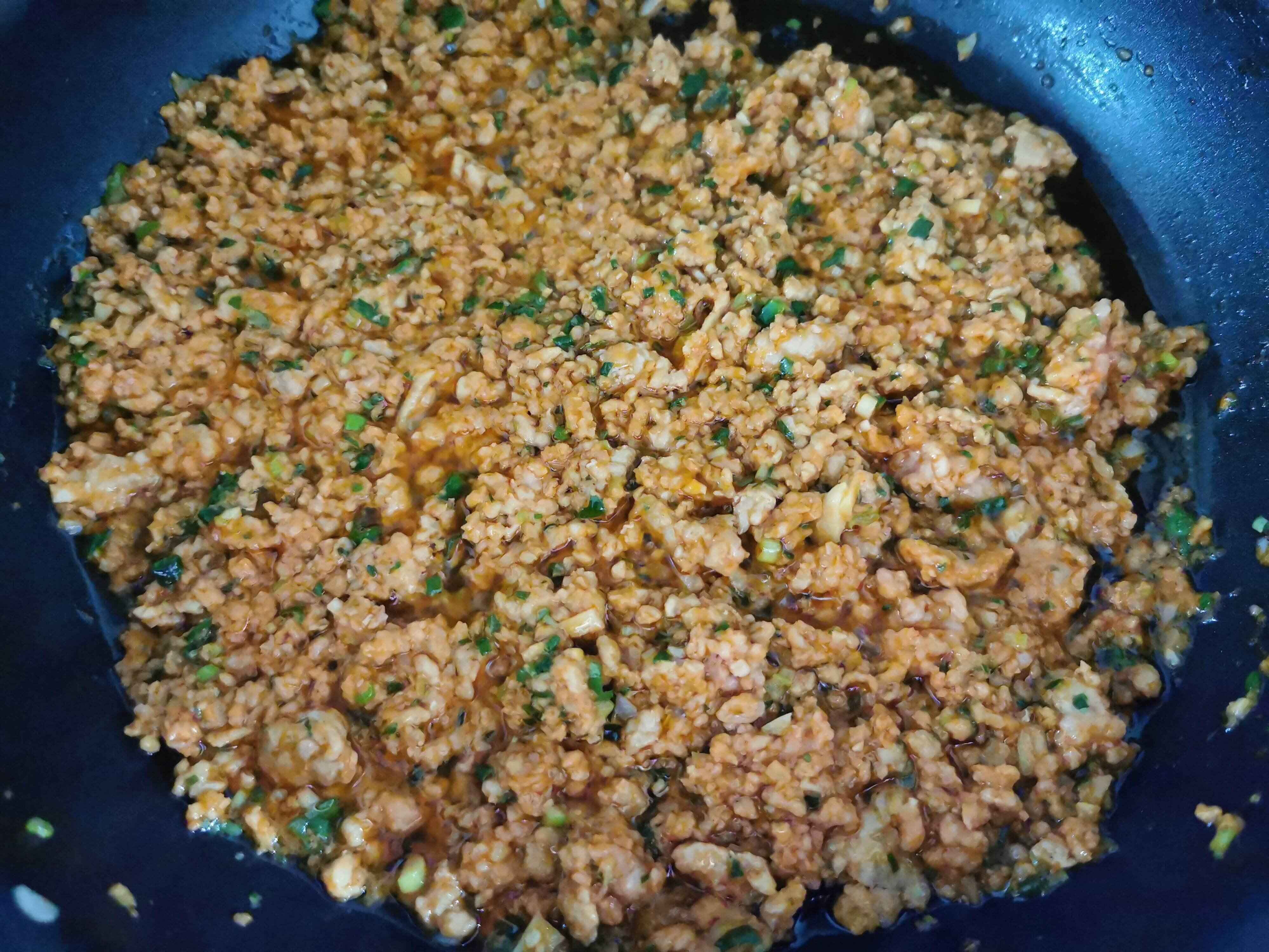(3)豚ひき肉とコチュジャンを加えてさらに加熱する。