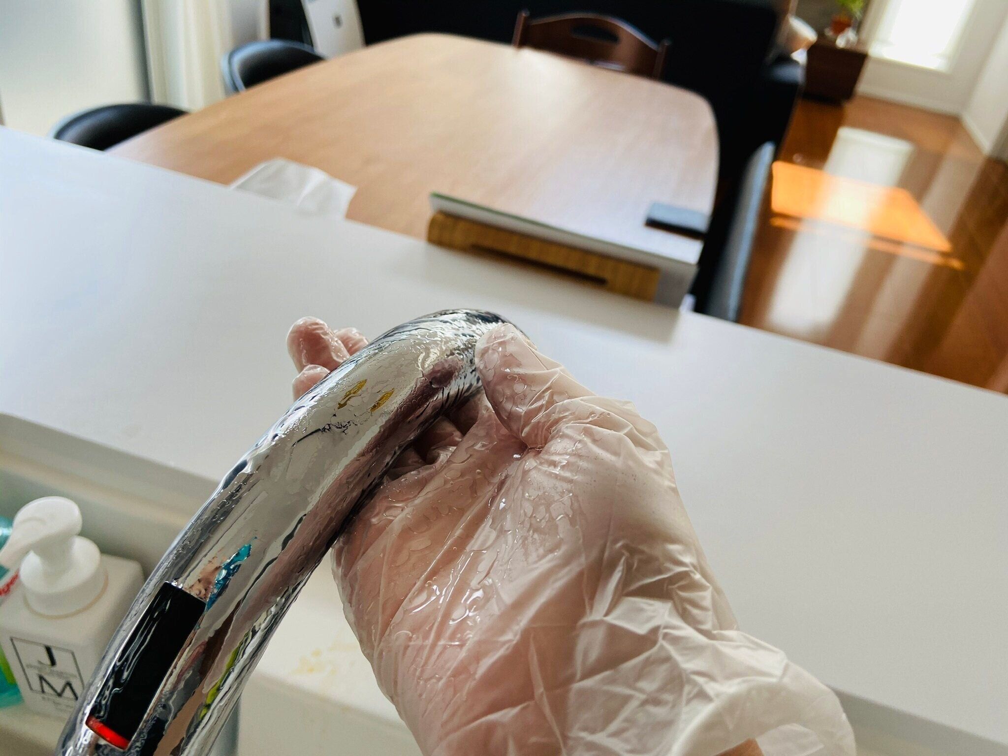 クエン酸ジェルが出来上がったら熱いうちに水垢が気になるところへ塗布します、ズボラな私はゴム手袋を使って直接手に取り塗布しました。