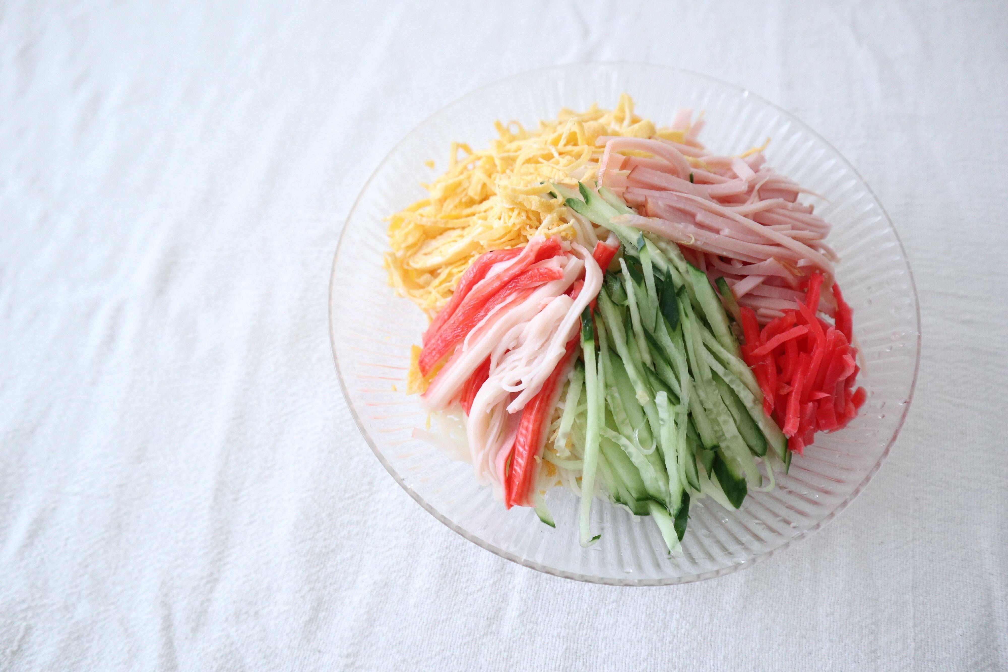 冷やし中華アレンジ。素麺の上に錦糸卵、胡瓜、ハム、かにかま、紅しょうがをのせて、冷やし中華のたれをかけたら完成です。甘酸っぱさがまだまだ残暑が続く今にぴったりです。