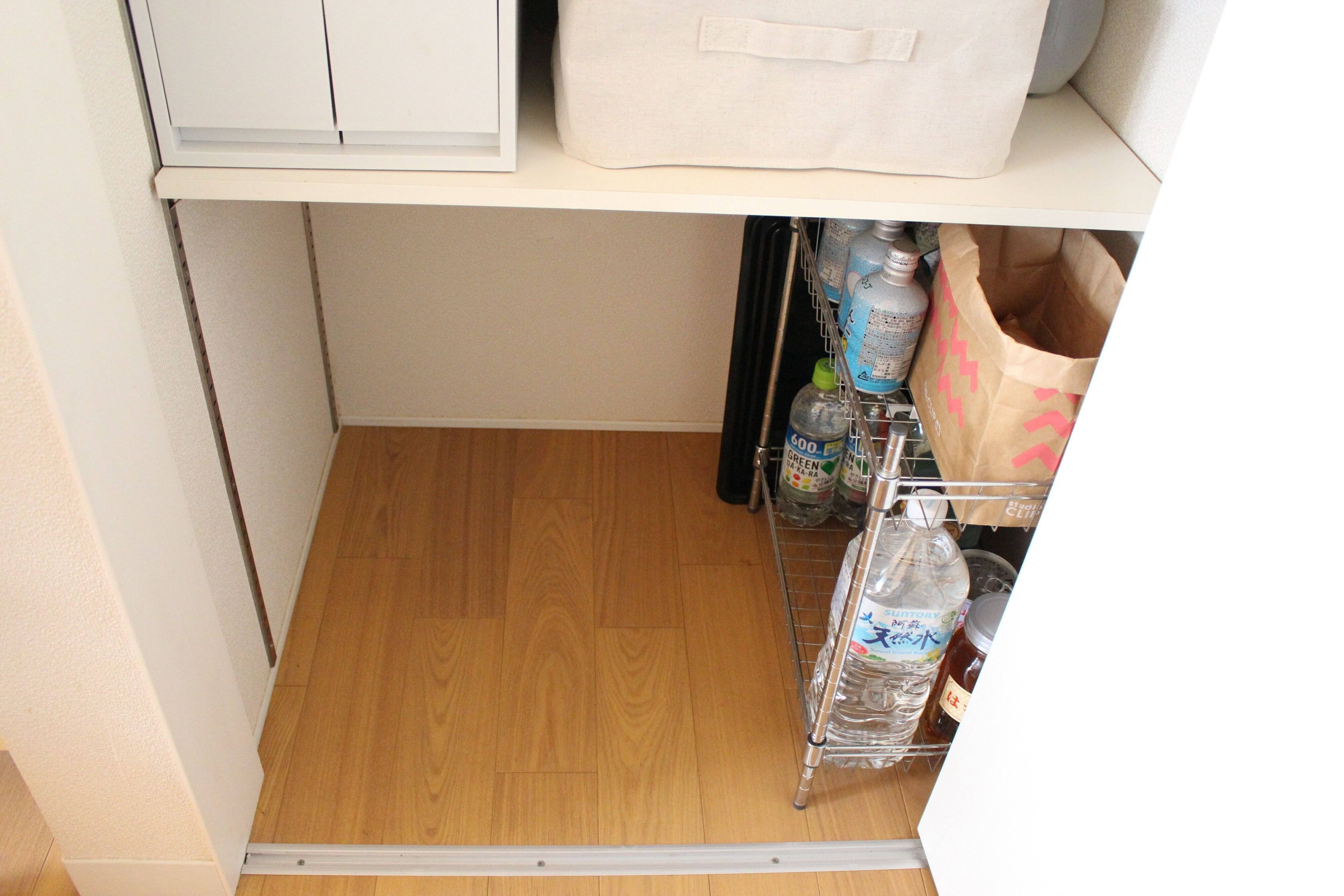 以前は空いている場所がないくらいここにはパンパンにものがありました。そのため、ビールやお米といった大きなものを一時的に保管する場所がなかったり、予定外にものをたくさん購入したり、頂いたときに収納できず、結局キッチンとは関係のない場所に仕方なく置いていました。