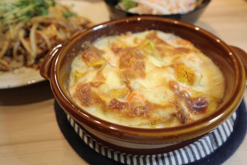 今回は、ホワイトソースを使わずに豆乳を使って簡単にできる、カボチャとサーモンのほくほくグラタンのレシピ紹介です。