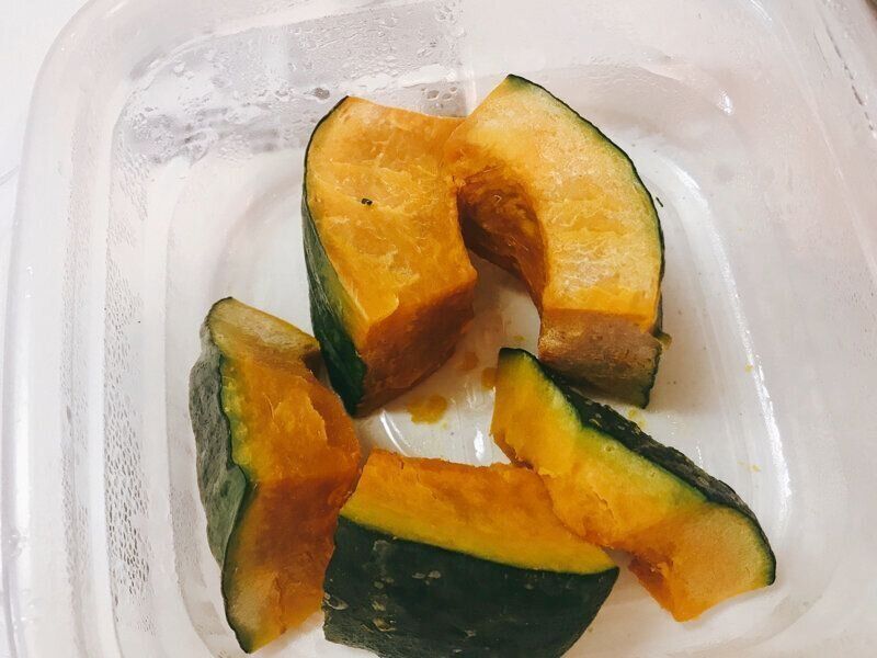 カボチャを角切りにカットし、耐熱容器に入れラップをふんわりとかけレンジへ入れます。600wで2分ほど加熱します。