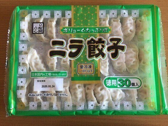 緑のパッケージのニラ餃子があります。