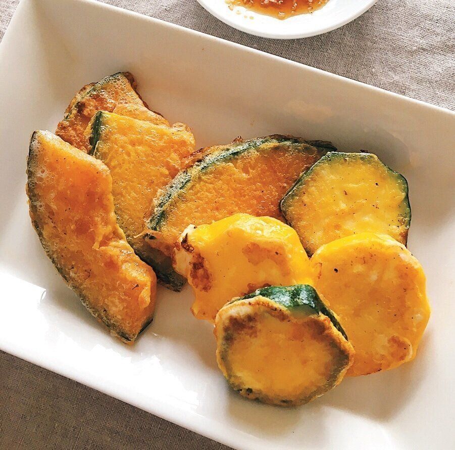 薄く切った野菜に薄力粉をまぶし、溶き卵にくぐらせて油で焼くだけの韓国料理のジョン。ズッキーニやかぼちゃなどが、薄力粉と卵のおかげでボリュームアップするのも高ポイント!