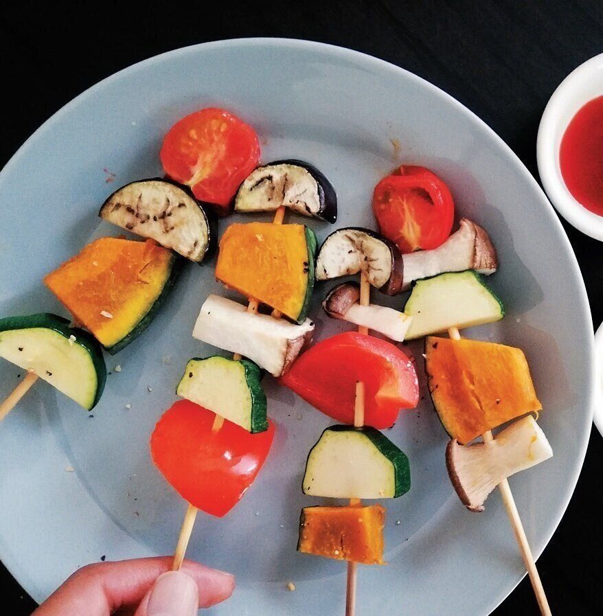 野菜は大きめに切り、オーブントースターで焼いて、串刺しに。ただの焼き野菜だって串に刺すだけで映えるし、子どももよく食べます。マヨネーズやケチャップを添えれば、つまみにも最高。
