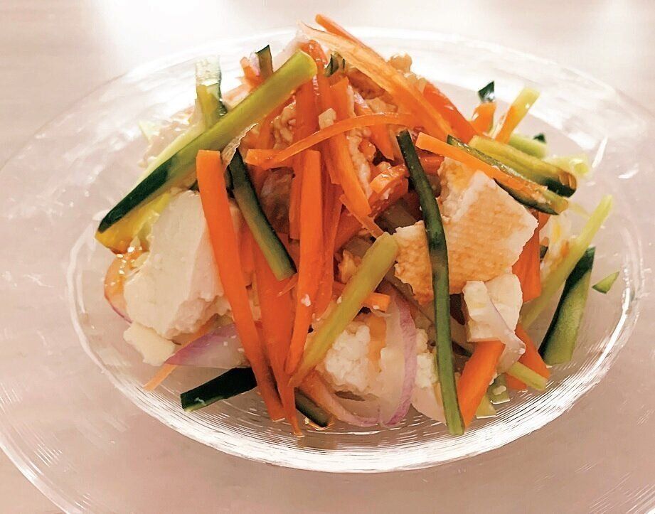 3cmくらい残った行き場のないきゅうり、にんじんなどを細切りや薄切りにして、豆腐にオン!野菜はこんもりと山形に盛ると、なんちゃってデリ風に見える~。ドレッシングは、ポン酢しょうゆとオリーブ油を混ぜてかけるのがおすすめです。
